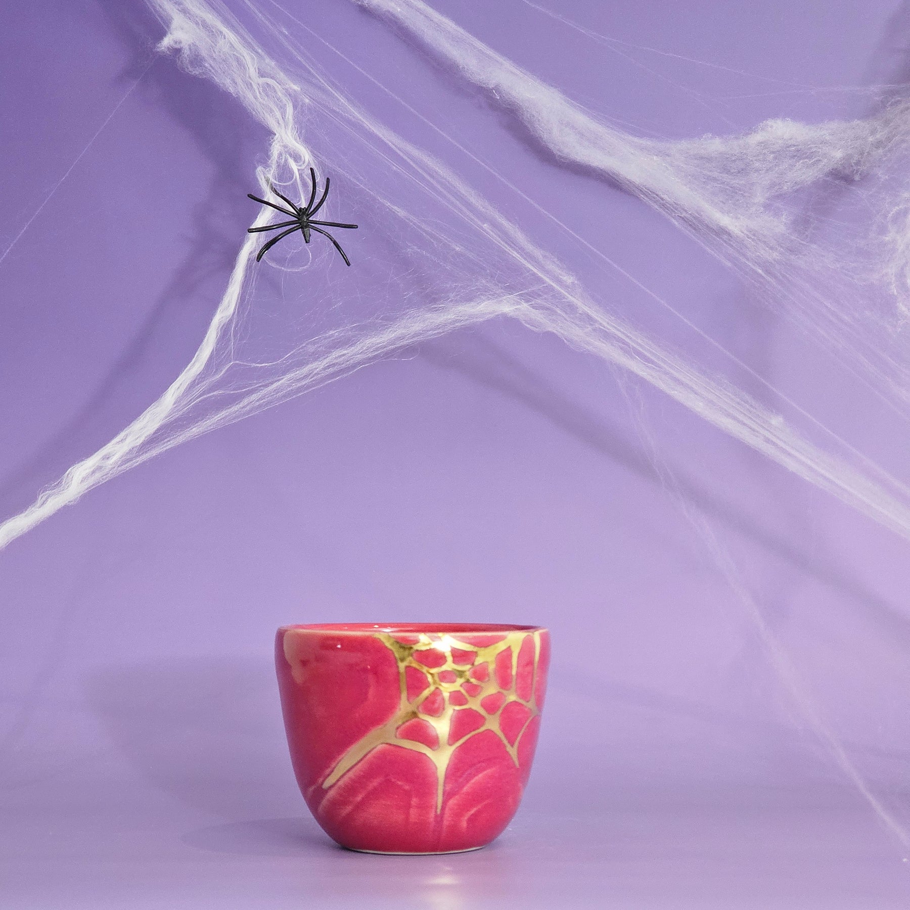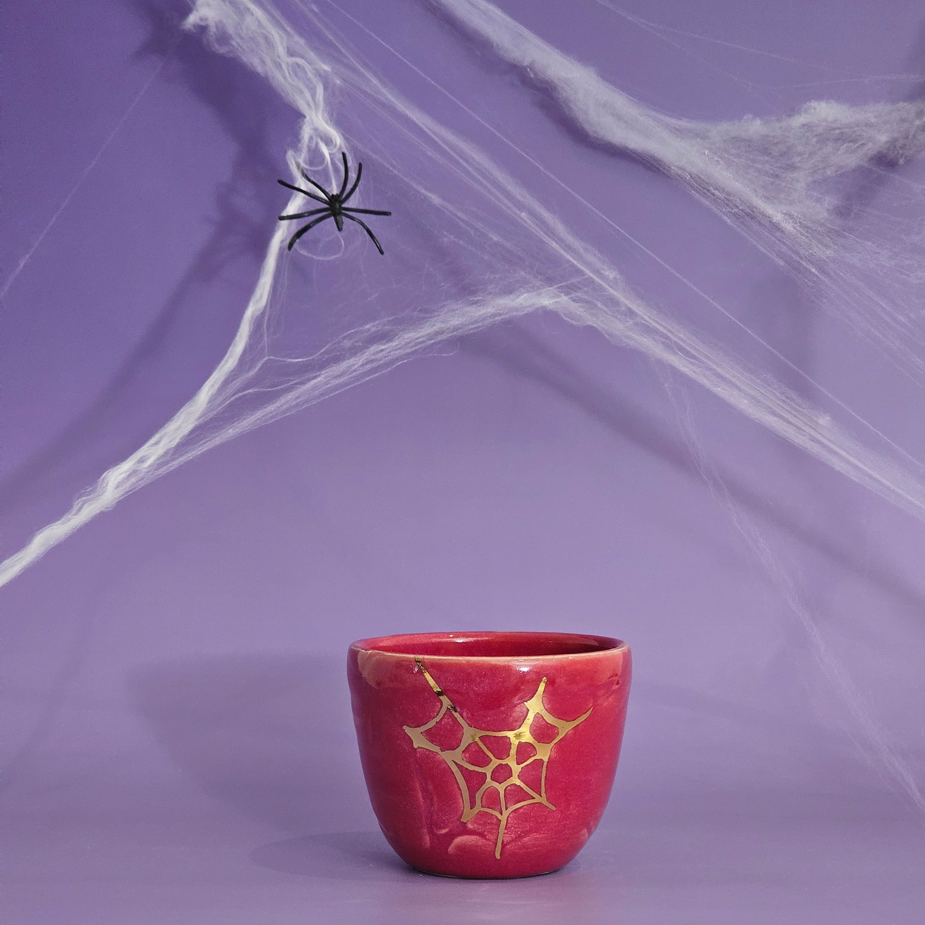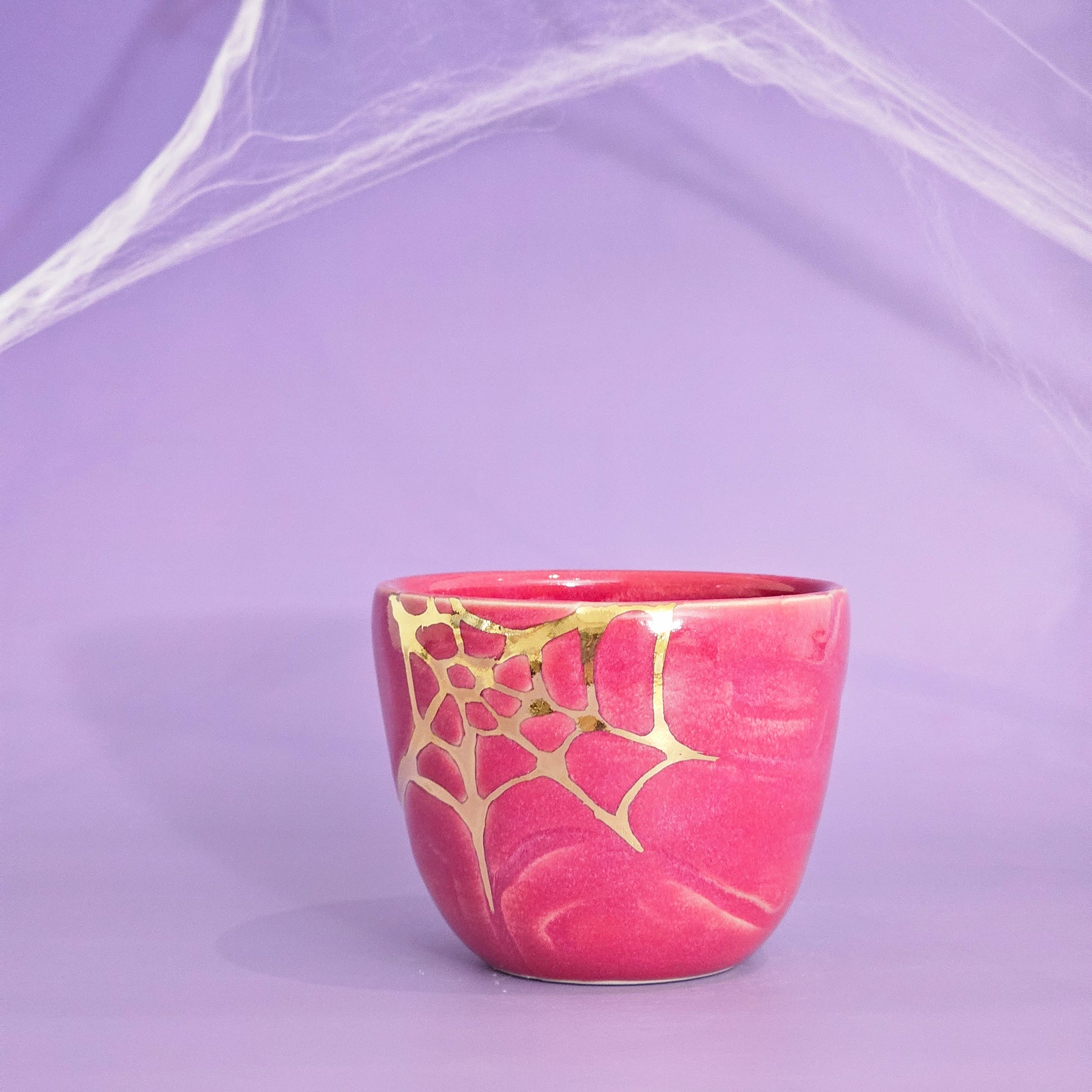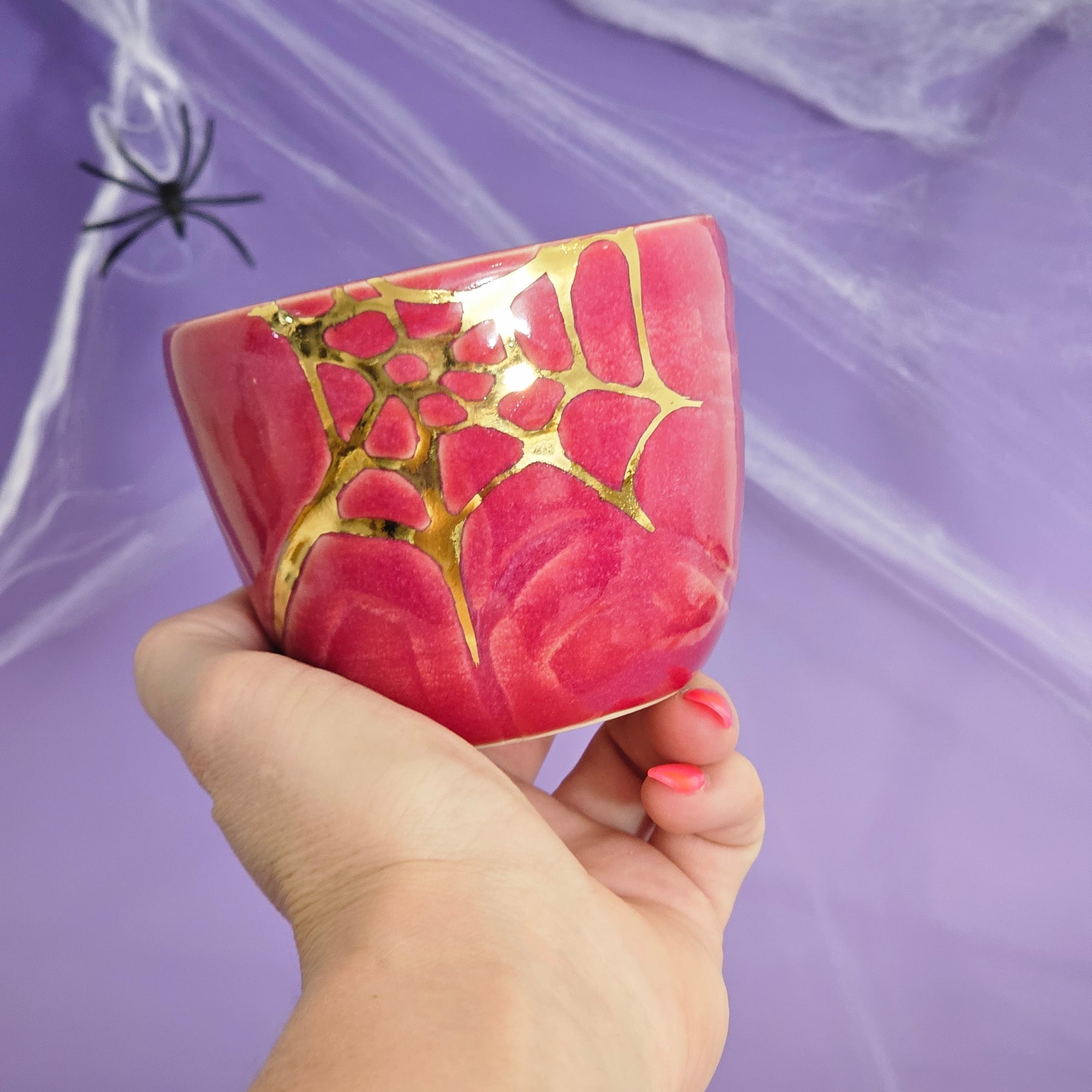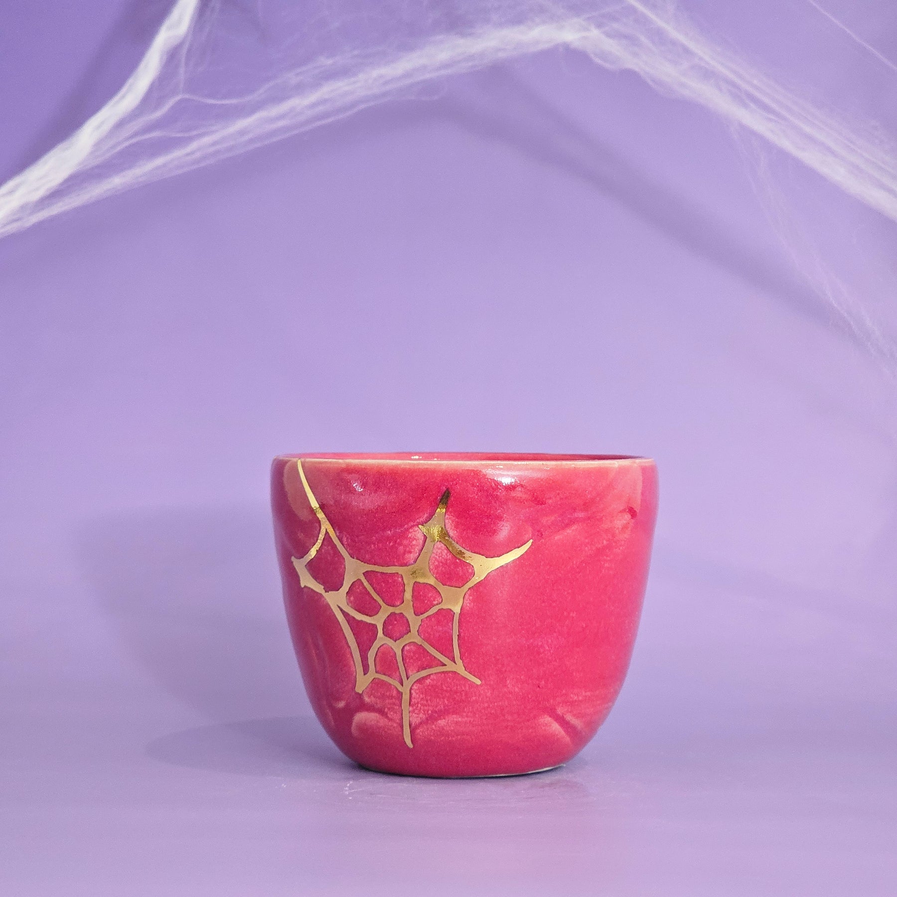 This glaze is very.. maroon? A pinky/purple/maroon, which looks a little different in different lighting! With a gold spider web